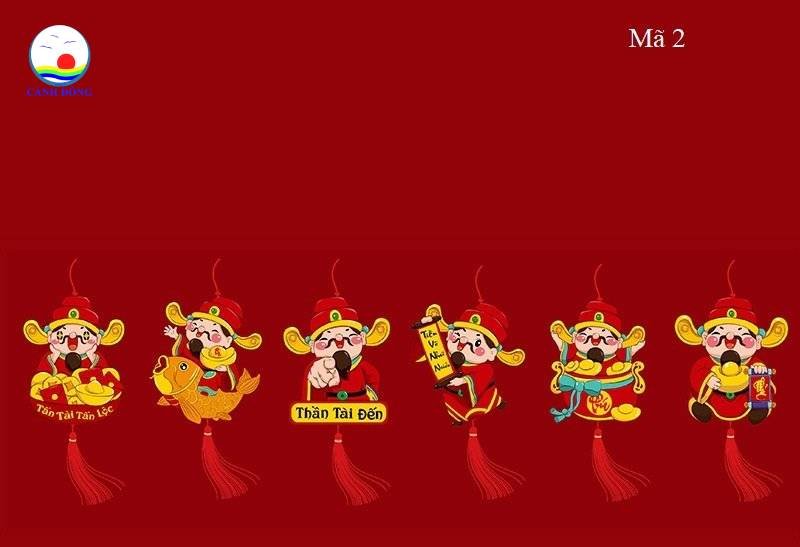 Đã nhắc đến Tết thì những hoạ tiết trang trí cũng sẽ liên quan đến Tết. Dây treo thần tài lắc đầu gọi tài lộc, hỷ phúc đến trang trí tết, trang trí cửa- Liễn thần tài lắc đầu, liễn treo tết sử dụng tone màu chính là màu đỏ, thể hiện sự may mắn. Đan xen một vài chấm vàng cho màu sắc thêm tươi tắn, nổi bật. Mỗi hoạ tiết đều mang những ý nghĩa đặc biệt.