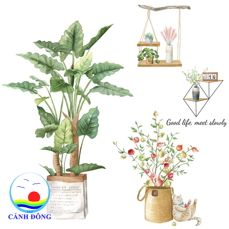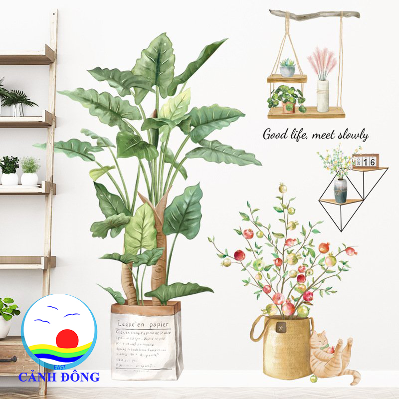 - Khu vườn nhiệt đới xuất hiện đầy đủ trong tấm decal dán tường nổi bật với hình ảnh cây ráy cảnh. Với kiểu dáng tự nhiên, ấn tượng bởi những lá to giống hình trái tim mọc vươn lên đón nắng mặt trời. Các cuốn lá dài thi nhau vươn cao mọc thành từng lớp ôm sát thân gốc. Màu xanh tươi mát, tự nhiên như cây thật, mang phong cách nhiệt đới, dân dã. Bên cạnh đó còn có hình ảnh chậu cây lựu, mặc dù nghe có vẻ đối lập nhưng sự kết hợp này mang lại sự hài hòa tổng thể, cân đối màu sắc, tạo nên bức tranh thiên nhiên sinh động, vui mắt. Không những thế, chậu lựu còn có tác dụng xua đuổi vận xui, mang may mắn, bình an đến với ngôi nhà thân yêu của bạn.