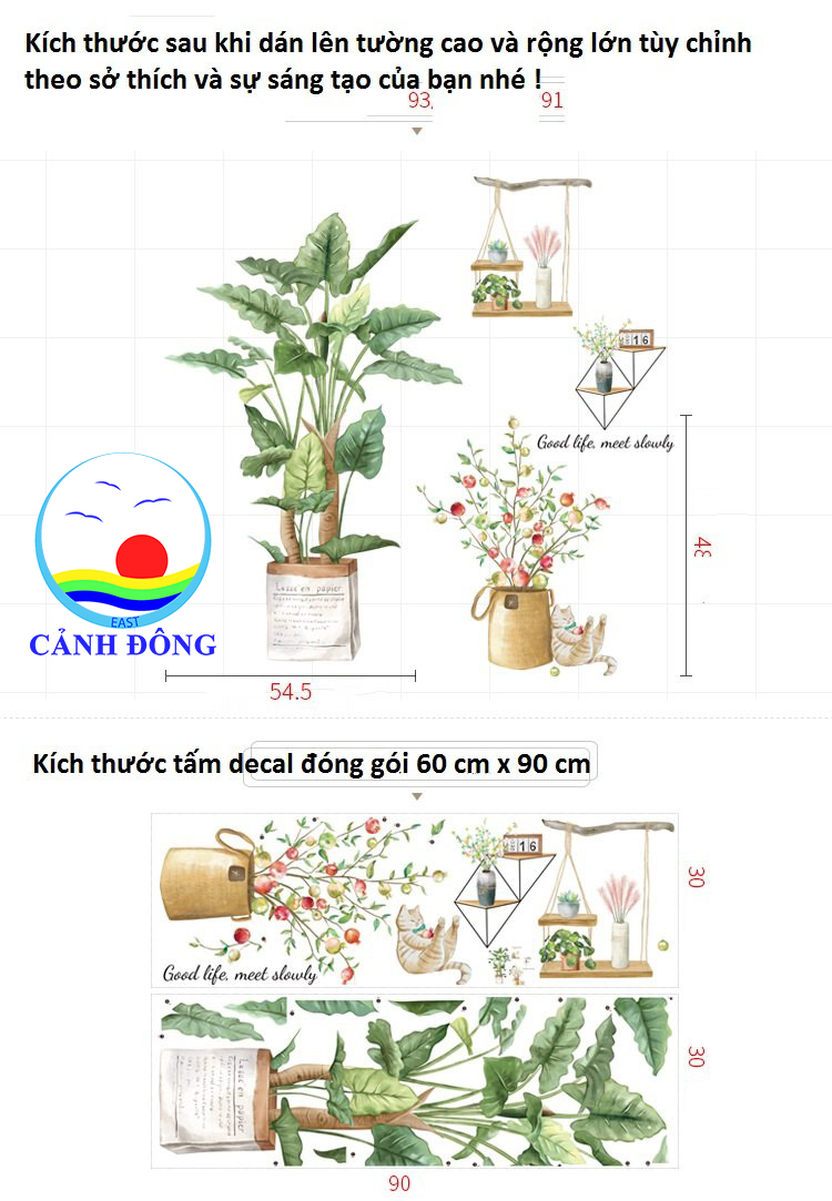 - Decal dán tường cây cảnh thiên nhiên nhiệt đới được làm từ chất liệu PVC cao cấp, bên ngoài có màn bảo vệ chồng trầy xước, chống nước hiệu quả. Các hình ảnh trên decal tách rời từng hình riêng lẽ nên bạn có thể thỏa sức sáng tạo, điều chỉnh kích thước tấm decal khi dán lên tường sao cho phù hợp không gian và nhu cầu trang trí của bạn. Chỉ với một thao tác đơn giản: mở lớp keo và dán lên tường là chúng ta đã có ngay mảng tường thiên nhiên tươi mát, sinh động rồi.