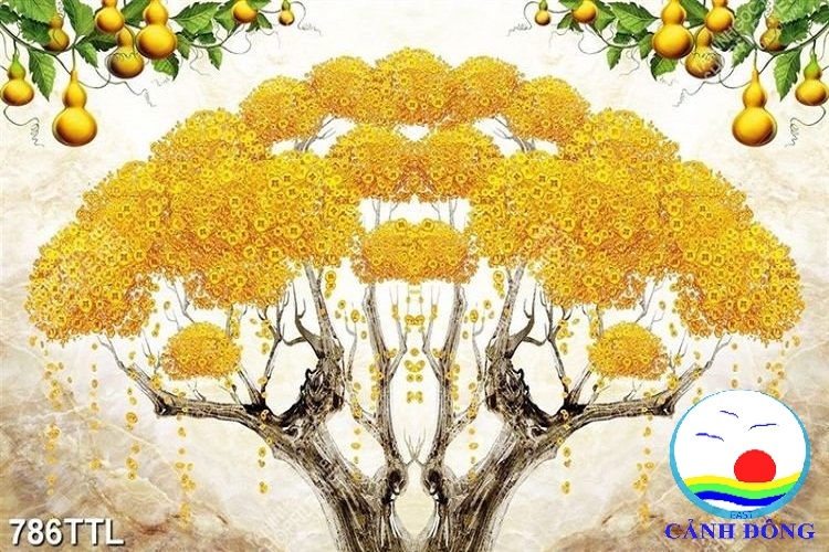 - Cả bức tranh với màu sắc chủ đạo là màu vàng – chỉ thế thôi cũng đủ thấy sự sung túc. Tán cây rộng lớn bao trùm cả khoảng không gian, chiếm trọn không gian trong bức tranh. Phía dưới là thảm cỏ cũng được lấy màu vàng làm nền. Tất cả gợi lên một màu sắc rực rỡ, bắt mắt. Toát lên vẻ quyền quý, giàu sang