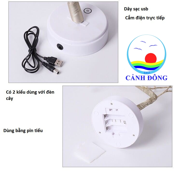 Đế của em đèn này mặc dù được làm bằng nhựa, không quá cầu kỳ nhưng vẫn giữ được độ trang nhã và chất lượng cao. Đèn cây để bàn bóng led rực rở sử dụng nguồn điện từ 3 pin tiểu AA hoặc có thể dùng điện 5V từ cổng USB vô cùng tiện lợi. Bạn có thể dễ dàng di chuyển chúng để trang trí cho những không gian khác nhau, như phòng khách, phòng ngủ, phòng làm việc…