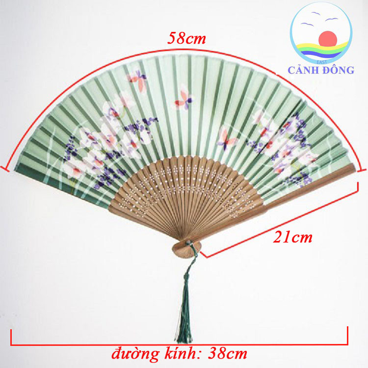 - Quạt giấy Nhật Bản thanh tre có độ xòe 58cm, độ dài 21cm. Quạt giấy gấp, mở dễ dàng, mang đến sự tiện lợi cho khác hàng khi sử dụng.