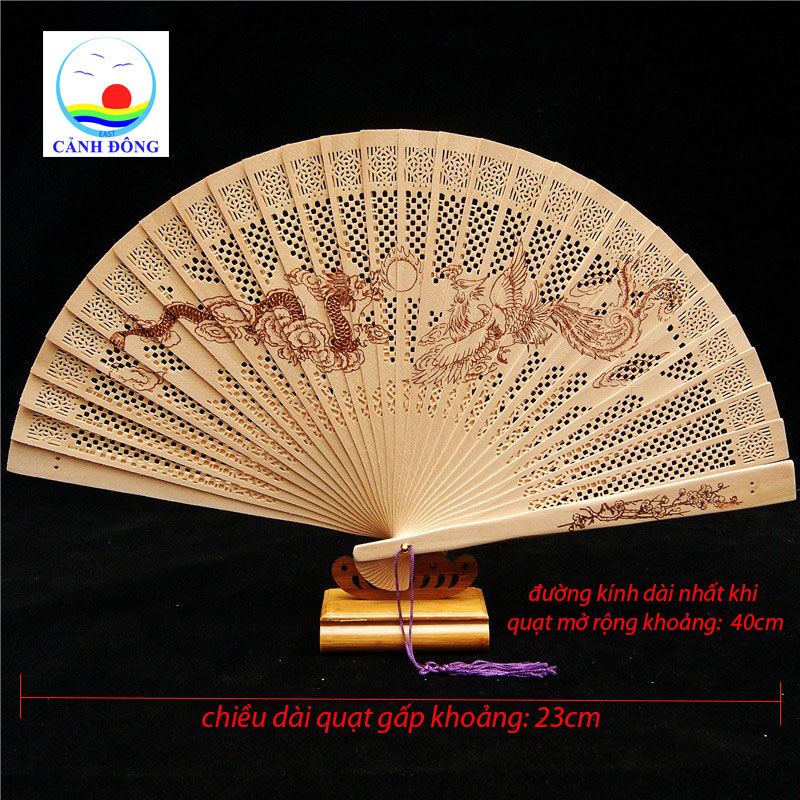 - Quạt gỗ long phụng thanh gỗ thơm sang trọng được thiết kế công phu và được làm hoàn toàn bằng tay thủ công từng công đoạn tạo nên một chiếc quạt gỗ long phụng vô cùng độc đáo